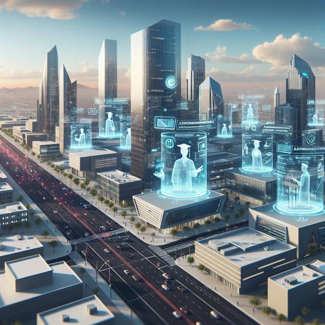 Prompt: The image generation prompt for DALLE-3 in a high-tech style, depicting the scene of bustling Arizona city transformed by Master's graduates in Public Administration, could be the following: "Generate an aerial view of a futuristic Arizona cityscape, with sleek and modern buildings towering against a backdrop of clear blue skies. In the streets, graduates with Master's degrees in Public Administration are seen engaging with the community, their animated discussions visible through transparent holographic displays. As they impart their expertise on managing public funds, a digital wave of organization and precision sweeps through the streets, represented by streams of data flowing seamlessly between the citizens and the administrative professionals. The city is alive with the hum of advanced technology, as robotic assistants and AI platforms assist in analyzing and optimizing financial strategies. The scene captures the seamless integration of public administration and high-tech innovation, ushering in a new era of efficiency and order in the city." The depiction should include only scenes, people, and objects, it should not include text or speech bubbles.