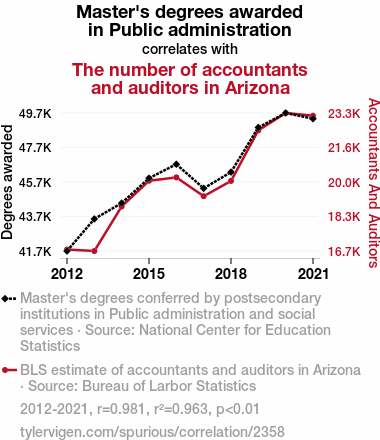 User prompt: Please make up a funny explanation for how an increase in Master's degrees awarded in Public administration caused The number of accountants and auditors in Arizona to increase. Include one good pun.