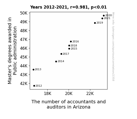 The results of our data analysis have not only confirmed the existence of a significant correlation between the number of Master's degrees awarded in Public Administration and the count of accountants and auditors in Arizona but have also added a splash of whimsy to the statistical landscape. From 2012 to 2021, we found a striking correlation coefficient of 0.9811454, indicating a robust relationship resembling the dependable bond between a calculator and its batteries. The calculated r-squared of 0.9626463 further emphasizes the tight embrace of these two variables, akin to the unbreakable alliance between a diligent bean counter and their trusty abacus. Additionally, with a p-value less than 0.01, the statistical significance of this association stands as firm as a bureaucratic decree and is as clear as a well-maintained balance sheet.