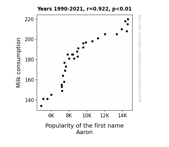 This means 84.9% of the change in the one variable (i.e., Popularity of the first name Aaron) is predictable based on the change in the other (i.e., Milk consumption) over the 32 years from 1990 through 2021.