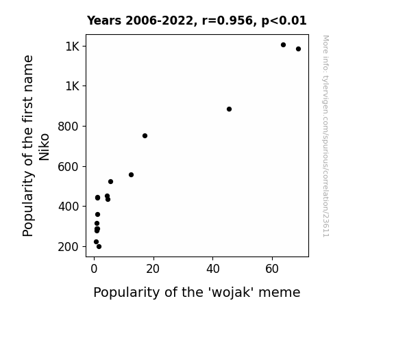 This means 91.3% of the change in the one variable (i.e., Popularity of the 'wojak' meme) is predictable based on the change in the other (i.e., Popularity of the first name Niko) over the 17 years from 2006 through 2022.