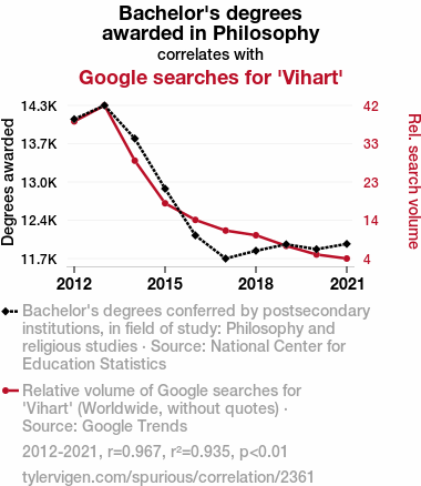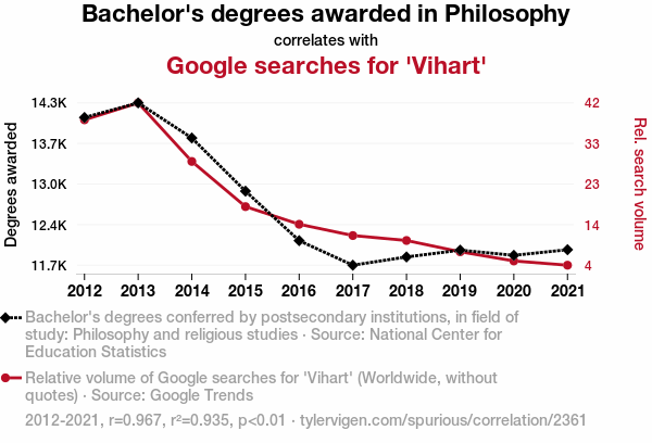 This means 93.5% of the change in the one variable (i.e., Google searches for 'Vihart') is predictable based on the change in the other (i.e., Bachelor's degrees awarded in Philosophy) over the 10 years from 2012 through 2021.