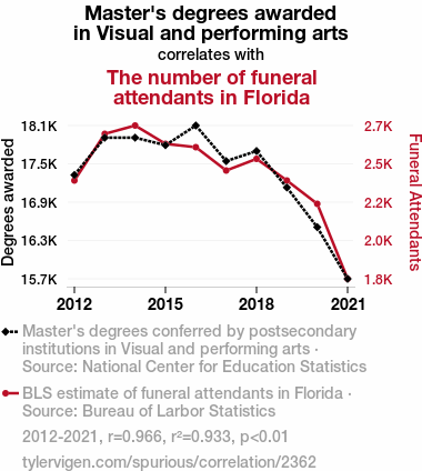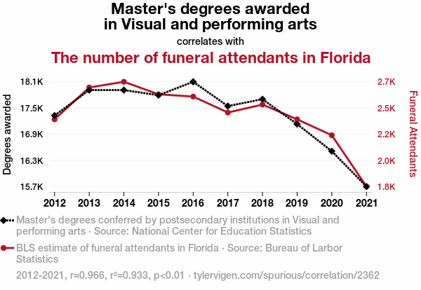 This means 93.3% of the change in the one variable (i.e., The number of funeral attendants in Florida) is predictable based on the change in the other (i.e., Master's degrees awarded in Visual and performing arts) over the 10 years from 2012 through 2021.