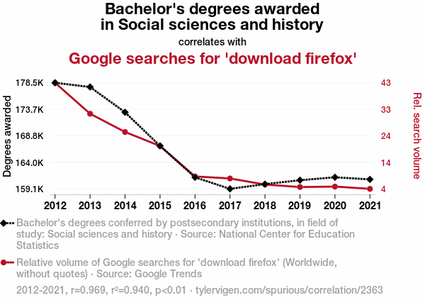 - The spurious research paper: Degrees of Surfin' History: The Correlation Between Social Sciences and History Bachelor's Degrees and Google Searches for 'Download Firefox'