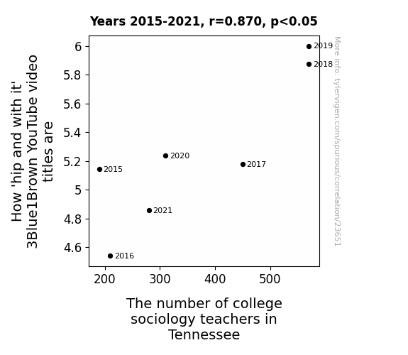 This means 75.7% of the change in the one variable (i.e., The number of college sociology teachers in Tennessee) is predictable based on the change in the other (i.e., How 'hip and with it' 3Blue1Brown YouTube video titles are) over the 7 years from 2015 through 2021.