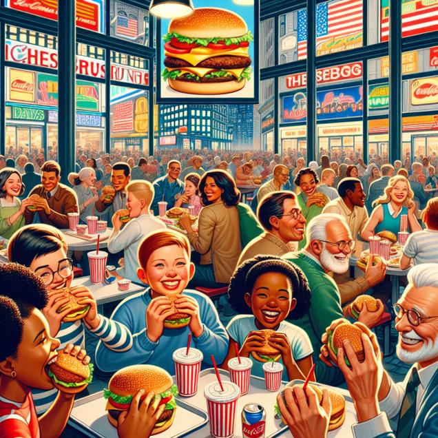 ChatGPT: In a bustling American city, people are seen enjoying delicious cheeseburgers at a fast-food restaurant. The aroma of sizzling American cheese fills the air as more and more cheeseburgers are being prepared to meet the growing demand. In the background, the Nasdaq stock exchange is depicted with stock prices rising on a digital display, showcasing the increased investor interest in fast food chains.