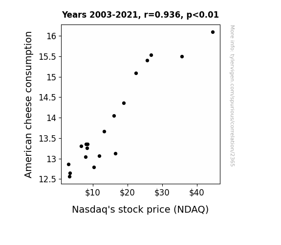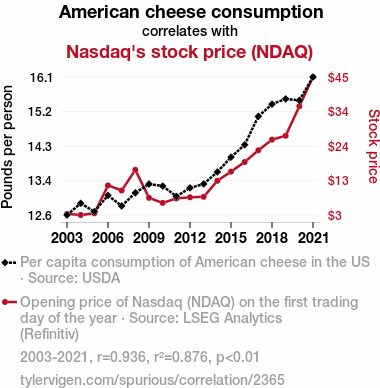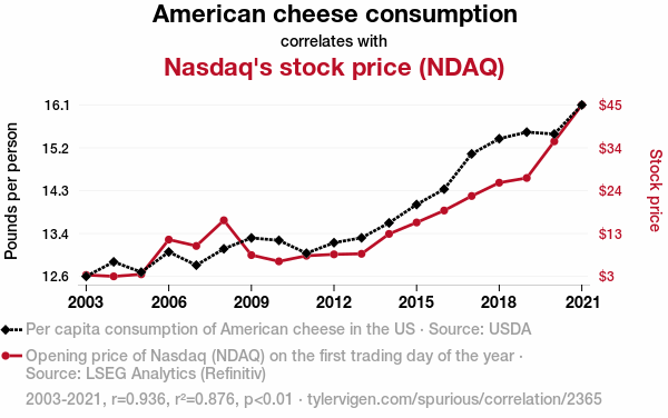 - The spurious research paper: Say Cheese: The Gouda, The Bad, and The Nasdaq - Exploring the Correlation Between American Cheese Consumption and NDAQ Stock Price