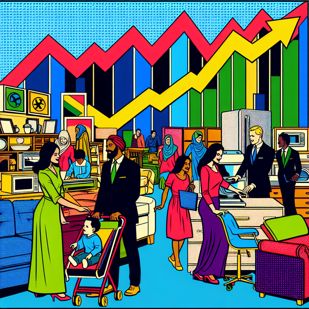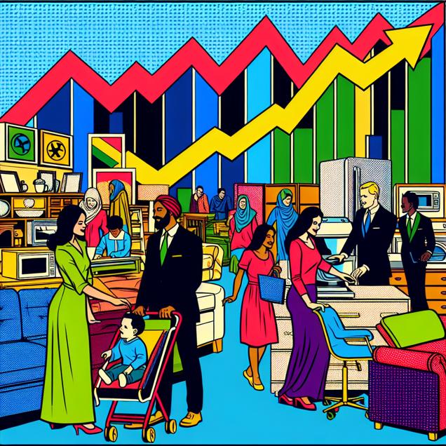 User prompt: Please respond with an image generation prompt that would be likely to create an interesting visual using DALLE-3, using the following style: [ Pop art ] and depicting this scene: Picture a bustling furniture store with families browsing through couches and coffee tables, while in the background, a stock market ticker displays the rising price of Fair Isaac's stock (FICO). As customers test out new appliances and pick out stylish furnishings, the stock price steadily climbs, illustrating the direct connection between household spending and stock market success. Keep the visual depiction simple. Do not include any words or speech bubbles.