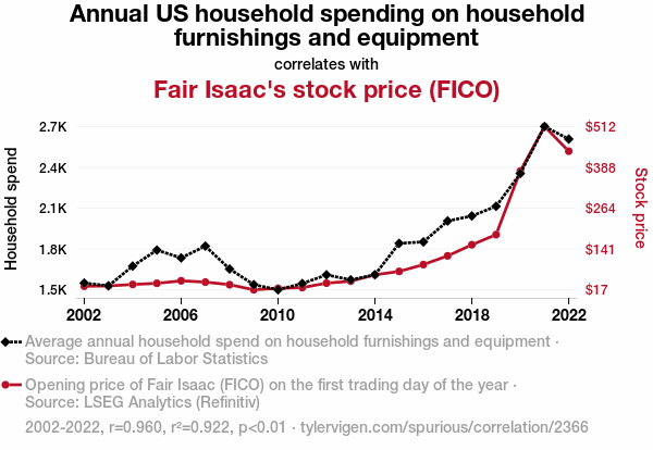 In this study, we set out to answer the age-old question: Does the annual US household spending on household furnishings and equipment have an impact on the stock price of Fair Isaac Corporation (FICO)? With a twinkle in our eyes and data in our spreadsheets, we dove into the treasure trove of Bureau of Labor Statistics and LSEG Analytics (Refinitiv) to unravel this mystery. Our findings, revealed against the backdrop of calculators and scatter plots, brought forth a correlation coefficient of 0.9600525 and a p-value of less than 0.01 for the time span of 2002 to 2022. Stay tuned as we present this data-driven dance of dollars and stocks, where even the most mundane household item can hold the key to Wall Street's whims and wonders!