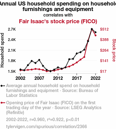 User prompt: Please provide potential search keywords for a paper titled FICO Fever: Uncovering the Household Spending and Stock Market Connection with an abstract of In this study, we set out to answer the age-old question: Does the annual US household spending on household furnishings and equipment have an impact on the stock price of Fair Isaac Corporation (FICO)? With a twinkle in our eyes and data in our spreadsheets, we dove into the treasure trove of Bureau of Labor Statistics and LSEG Analytics (Refinitiv) to unravel this mystery. Our findings, revealed against the backdrop of calculators and scatter plots, brought forth a correlation coefficient of 0.9600525 and a p-value of less than 0.01 for the time span of 2002 to 2022. Stay tuned as we present this data-driven dance of dollars and stocks, where even the most mundane household item can hold the key to Wall Street's whims and wonders!
