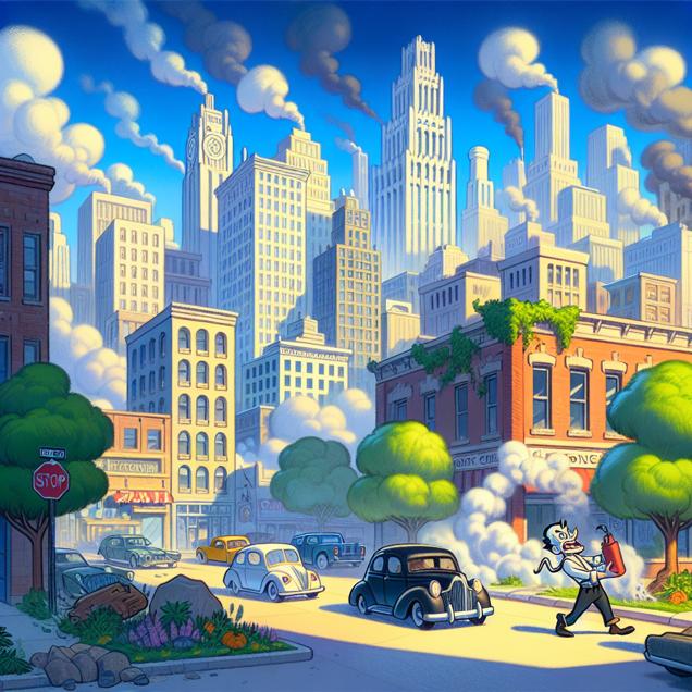 ChatGPT: Create an image that looks like a scene from a Pixar movie. Show a picturesque Quincy, Illinois, with clear blue skies and cleaner air. The city should be depicted as if it's thriving under the absence of smog and haze, with clean streets and vibrant greenery. Meanwhile, showcase a struggling arsonist in another part of the United States, trying to ignite a fire but failing due to the lack of pollution fueling their destructive tendencies. The contrast between the thriving Quincy and the thwarted arsonist should be visually compelling, capturing the impact of cleaner air on both the environment and criminal activities.