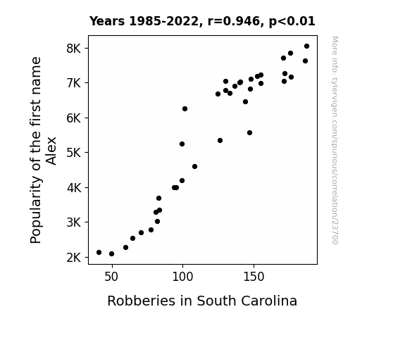 This means 89.6% of the change in the one variable (i.e., Robberies in South Carolina) is predictable based on the change in the other (i.e., Popularity of the first name Alex) over the 38 years from 1985 through 2022.