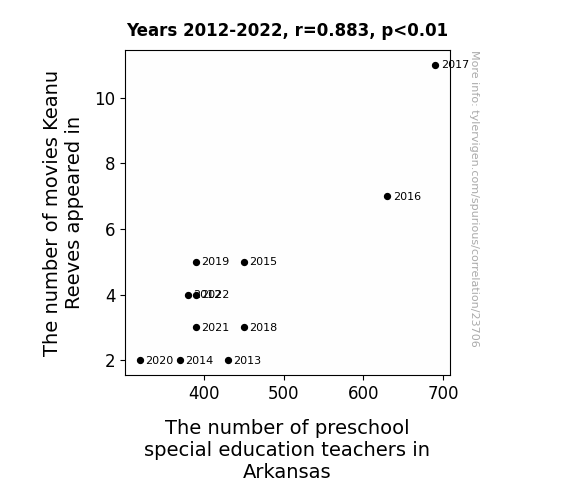 This means 78% of the change in the one variable (i.e., The number of preschool special education teachers in Arkansas) is predictable based on the change in the other (i.e., The number of movies Keanu Reeves appeared in) over the 11 years from 2012 through 2022.
