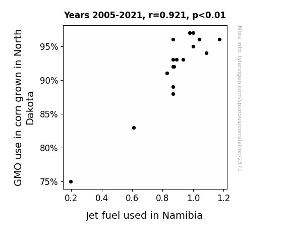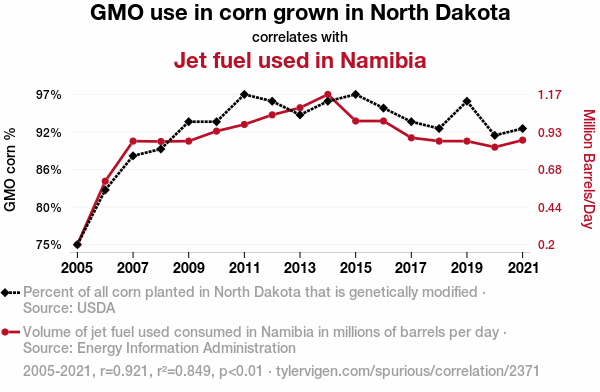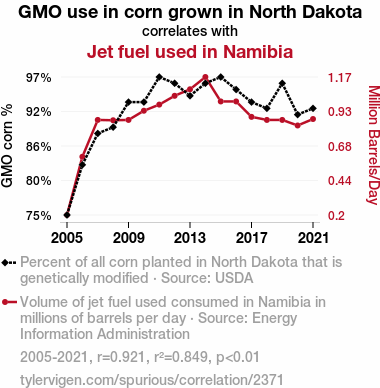 This means 84.9% of the change in the one variable (i.e., Jet fuel used in Namibia) is predictable based on the change in the other (i.e., GMO use in corn grown in North Dakota) over the 17 years from 2005 through 2021.