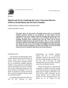 User prompt: Please provide potential search keywords for a paper titled Biotech and Jet Set: Exploring the Corny Connection Between GMOs in North Dakota and Jet Fuel in Namibia with an abstract of This paper delves into the peculiar relationship between the use of genetically modified organisms (GMOs) in corn production in North Dakota and the consumption of jet fuel in Namibia. While this seemingly odd pairing may evoke chuckles, our study takes a serious look at the correlation between these two seemingly unrelated factors. Analyzing data from the USDA and the Energy Information Administration for the period of 2005 to 2021, we reveal a surprising correlation coefficient of 0.9214996 and a statistically significant p-value of less than 0.01. Despite the corny nature of our findings, they highlight a potentially intriguing link worthy of further investigation. So, fasten your seatbelts as we take off on this unexpected journey through the agricultural and energy landscapes!