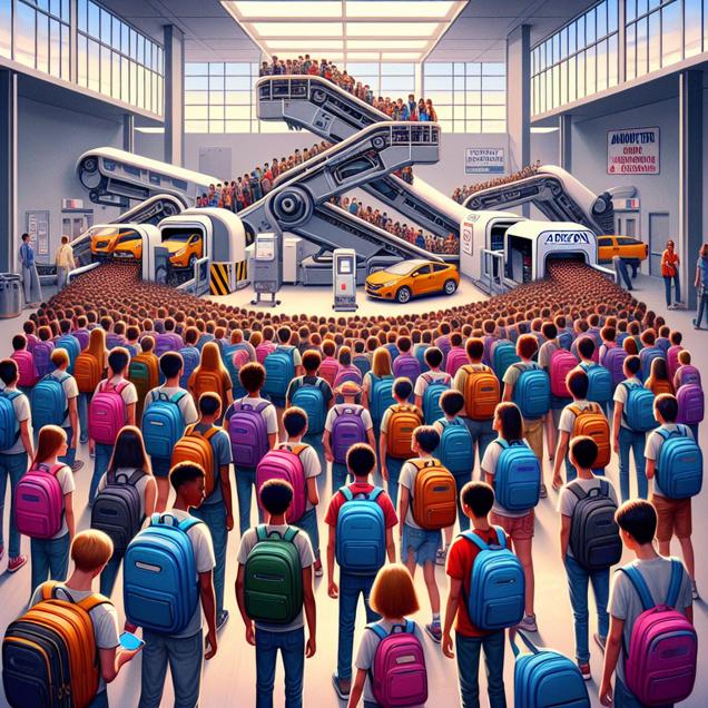 ChatGPT: Prompt: In a futuristic school hallway, a crowd of 11th graders stand with their high-tech backpacks, each struggling with malfunctioning zippers. Automated conveyor belt operators from Arizona attempt to maintain order, but they are overwhelmed by the sheer volume. Backpacks are getting stuck in the system, leading to a chaotic jam and frustrated students unable to carry their burdens.