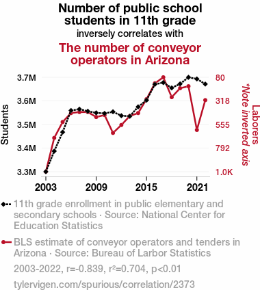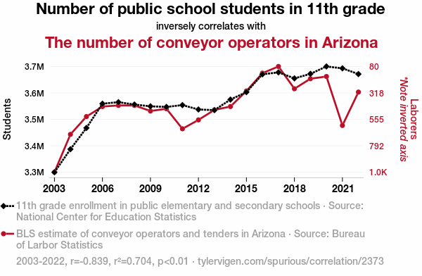 Conveyor operators, 11th grade students Arizona, public school employment correlation, education statistics employment data, Bureau of Labor Statistics, National Center for Education Statistics, Arizona student employment trends, unusual correlation between students and employment, statistical analysis comical findings