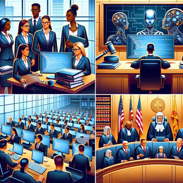 ChatGPT: In a vibrant office setting, a group of individuals proudly displaying their Master's degrees in information sciences are seen surrounded by computer screens and coding textbooks. As they work meticulously, a digital assistant, equipped with advanced AI technology, efficiently manages the judicial proceedings, effectively handling paperwork and court cases with remarkable precision. Meanwhile, in the state of New Mexico, the number of judges in the courtroom begins to increase rapidly, responding to the growing demand for their expertise, triggered by the remarkable efficiency of the AI-powered judicial assistants.