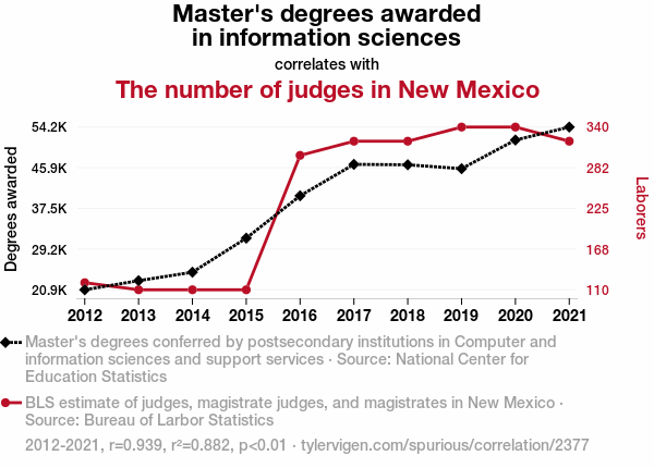 User prompt: Please provide potential search keywords for a paper titled Infomastrz Gradz and Judge Counts: A Tale of Information Sciences and Jurisdiction with an abstract of In the realm of academia, it's no secret that the relationship between master's degrees awarded in information sciences and the number of judges in New Mexico has been a topic of curiosity. Much like a good dad joke, the correlation between these two seemingly unrelated entities may leave us scratching our heads.