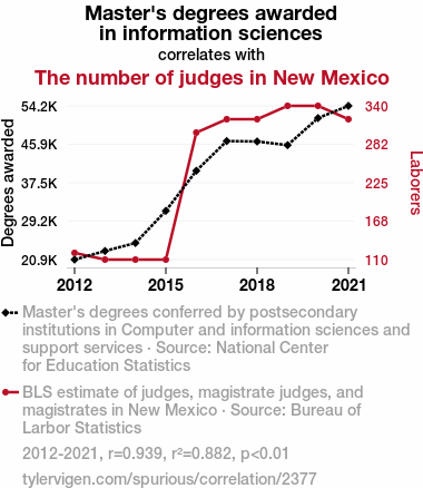 User prompt: Please make up a funny explanation for how an increase in Master's degrees awarded in information sciences caused The number of judges in New Mexico to increase. Add a funny one-liner at the end.