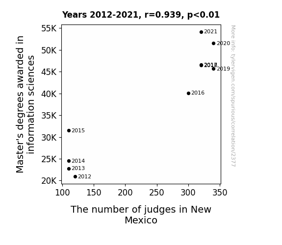The analysis of data collected from the National Center for Education Statistics and the Bureau of Labor Statistics for the time period 2012 to 2021 revealed a strong and eyebrow-raising correlation between the number of Master's degrees awarded in information sciences and the number of judges in the state of New Mexico. The calculated correlation coefficient of 0.9391181 and an r-squared value of 0.8819428 left our research team feeling as pleasantly surprised as stumbling upon a well-timed dad joke at a family gathering.