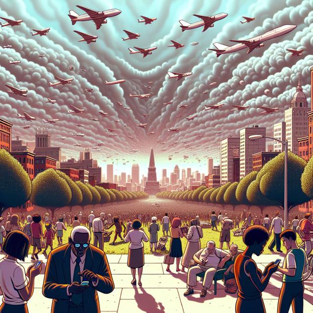 Prompt: Generate an image of a 3D Pixar-style cityscape in Massachusetts, where an increasing number of planes fill the skies, causing disturbances in the atmosphere. In the background, cemeteries are depicted with dormant zombies twitching into life as concerned citizens can be seen searching on their devices for the nearest zombie escape routes. The depiction should include only scenes, people, and objects, it should not include text or speech bubbles.