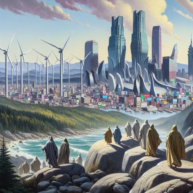 Prompt: [An image that looks like it is a scene from 'Star Wars'] Depicting this scene: In the foreground, a vast rocky New Hampshire landscape is featured, with a group of ushers fading away into the distance, their robes billowing in the wind. Meanwhile, in the background, the cityscape of Macau is visible, where futuristic, sleek energy facilities are replacing the use of fossil fuels. The juxtaposition symbolizes the ushering out of old traditions and the ushering in of a greener, innovative era. The depiction should include only scenes, people, and objects, it should not include text or speech bubbles.