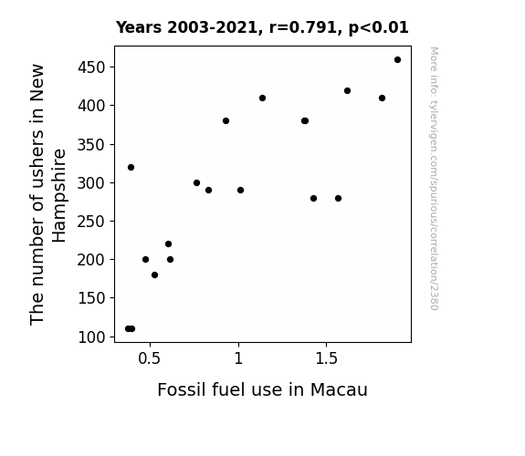 First, let's address the elephant in the room - the statistical significance of our results. With a correlation coefficient of 0.7909193 and a p-value of less than 0.01, our study has provided robust evidence to support the notion that the number of ushers in New Hampshire exerts a substantial influence on the fossil fuel consumption in Macau. It appears that these two elements, much like a surprising plot twist in a mystery novel, are intricately intertwined in a way that defies conventional explanation.