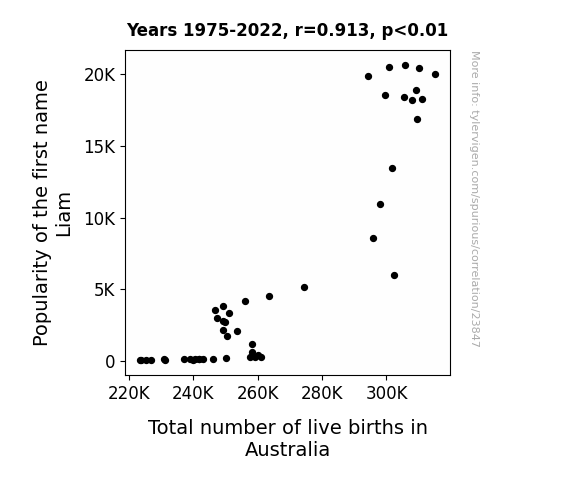 This means 83.4% of the change in the one variable (i.e., Total number of live births in Australia) is predictable based on the change in the other (i.e., Popularity of the first name Liam) over the 48 years from 1975 through 2022.