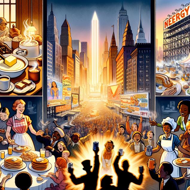 Prompt: An image that looks like it is a scene from A Disney Movie, showcasing the morning hustle and bustle of a vibrant city. On the left, a picturesque scene of a family breakfast with butter melting on golden toast, steaming pancakes, and flaky croissants. The foreground features a warm color palette, inviting viewers to join in the cozy atmosphere. In the distance, towering skyscrapers and a bustling stock exchange board with a prominent upward arrow, symbolizing the soaring stock price of Monster Beverage. The energy demand is highlighted by the presence of people sipping on cans of the popular energy drink. The image exudes a sense of magical energy and excitement, capturing the urban rhythm of a lively city morning. The depiction should include only scenes, people, and objects, it should not include text or speech bubbles.