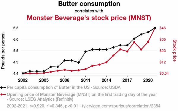 The curious case of the relationship between butter consumption and Monster Beverage's stock price (MNST) has long puzzled financial analysts. The aim of this study was to shed light on this peculiar pairing through a rigorous analysis utilizing data from the USDA and LSEG Analytics (Refinitiv). Our findings reveal a surprisingly strong positive correlation, with a correlation coefficient of 0.9198682 and a p-value less than 0.01 for the years 2002 to 2021.
