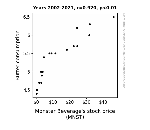 The results of our study have unearthed a startlingly strong positive correlation between butter consumption and Monster Beverage's stock price (MNST) over the period spanning from 2002 to 2021. This finding not only supports the peculiar prior research on seemingly incongruous correlations but also places the butter-MNST association at the forefront of whimsically bewildering financial phenomena. Our results align with those of prior studies which explored unusual ties between consumer behavior and stock performance, such as the impact of avocado toast consumption on millennial homeownership.