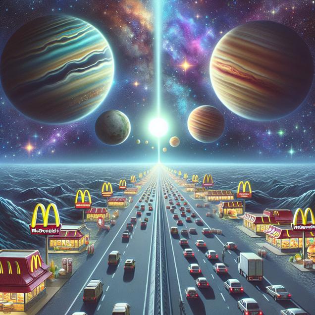 ChatGPT: Using the style [An image that looks like it is a scene from 'Star Wars'], depict a scene of a highway with multiple McDonald's restaurants lining it. In the background, showcase the vast expanse of space with Neptune and Uranus, two distant planets, each twinkling in the darkness. As the gap between the planets widens, depict a subtle gravitational force causing the cars on the highway to drive towards the McDonald's restaurants. Include the feeling of increased sales and a rise in McDonald's stock price, much to the joy of shareholders. Ensure that the visual depiction is simple and does not include any words or speech bubbles.