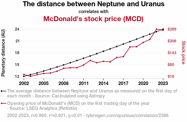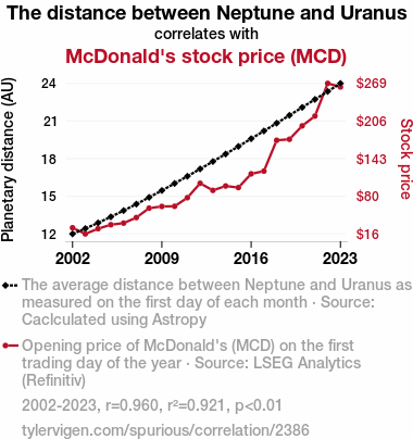 - The spurious research paper: Planetary Puzzles and Stock Market Shenanigans: Unraveling the Relationship Between Neptune's Dance with Uranus and McDonald's Stock Price