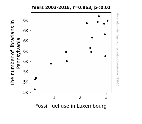 This means 74.5% of the change in the one variable (i.e., Fossil fuel use in Luxembourg) is predictable based on the change in the other (i.e., The number of librarians in Pennsylvania) over the 16 years from 2003 through 2018.
