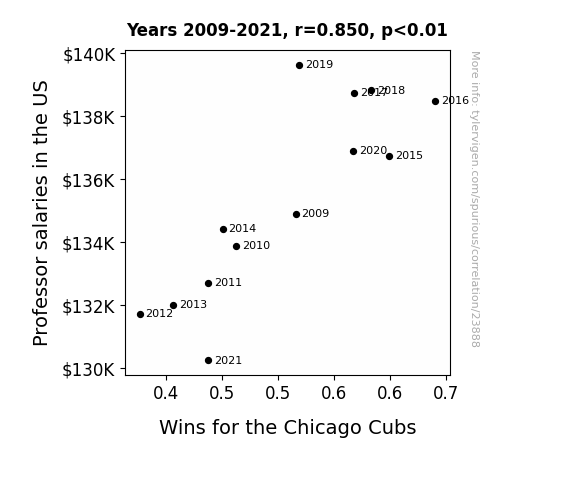 This means 72.3% of the change in the one variable (i.e., Wins for the Chicago Cubs) is predictable based on the change in the other (i.e., Professor salaries in the US) over the 13 years from 2009 through 2021.