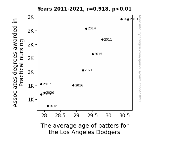 This means 84.3% of the change in the one variable (i.e., The average age of batters for the Los Angeles Dodgers) is predictable based on the change in the other (i.e., Associates degrees awarded in Practical nursing) over the 11 years from 2011 through 2021.