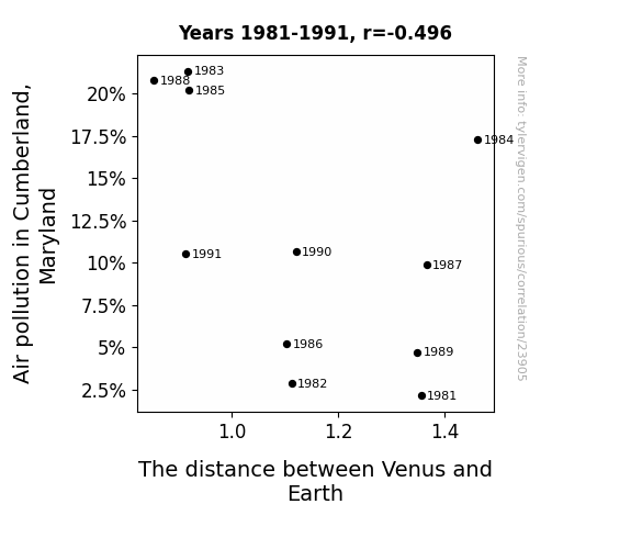 This means 24.6% of the change in the one variable (i.e., The distance between Venus and Earth) is predictable based on the change in the other (i.e., Air pollution in Cumberland, Maryland) over the 11 years from 1981 through 1991.