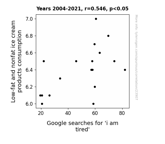 This means 29.9% of the change in the one variable (i.e., Google searches for 'i am tired') is predictable based on the change in the other (i.e., Low-fat and nonfat ice cream products consumption) over the 18 years from 2004 through 2021.