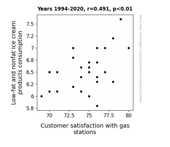 This means 24.1% of the change in the one variable (i.e., Customer satisfaction with gas stations) is predictable based on the change in the other (i.e., Low-fat and nonfat ice cream products consumption) over the 27 years from 1994 through 2020.