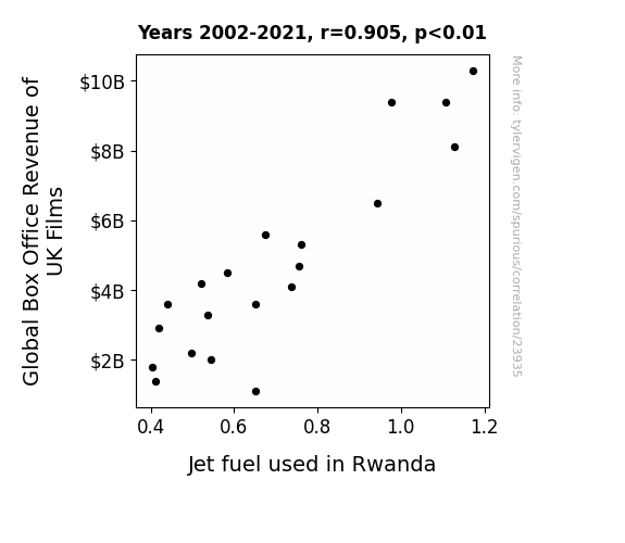 This means 82% of the change in the one variable (i.e., Jet fuel used in Rwanda) is predictable based on the change in the other (i.e., Global Box Office Revenue of UK Films) over the 20 years from 2002 through 2021.