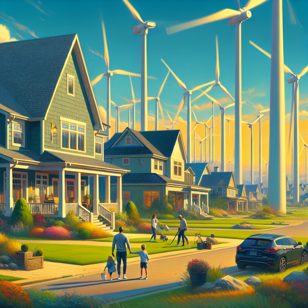 ChatGPT: Generate an image of a serene, picturesque neighborhood in the United States, characterized by charming houses with vibrant colors and well-manicured lawns. In the distance, incorporate towering wind turbines in New Caledonia, spinning rapidly to harness the strong winds. Furthermore, show a subtle visual narrative of single fathers leading households, possibly in the form of a man engaged in daily activities with his children, hinting at the influence of romantic connections with New Caledonian bachelors due to the carried suave French accents on the wind. The image should exude a hyper-realistic quality, capturing the juxtaposition of the tranquil neighborhood with the distant, bustling energy of the wind turbines and the evolving societal dynamics.