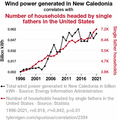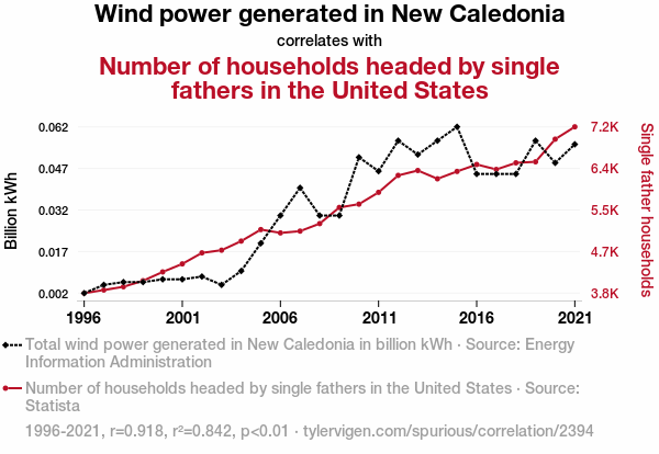 This means 84.2% of the change in the one variable (i.e., Number of households headed by single fathers in the United States) is predictable based on the change in the other (i.e., Wind power generated in New Caledonia) over the 26 years from 1996 through 2021.