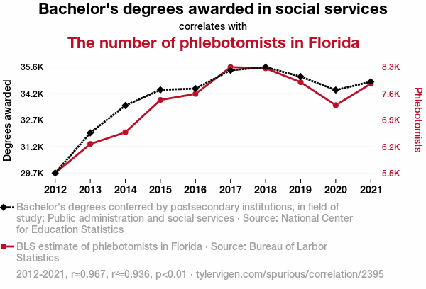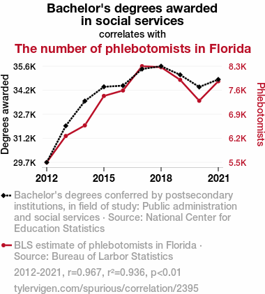 This means 93.6% of the change in the one variable (i.e., The number of phlebotomists in Florida) is predictable based on the change in the other (i.e., Bachelor's degrees awarded in social services) over the 10 years from 2012 through 2021.