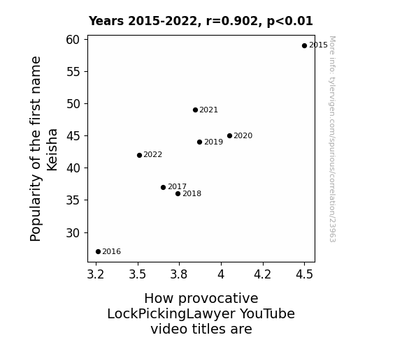 This means 81.3% of the change in the one variable (i.e., How provocative LockPickingLawyer YouTube video titles are) is predictable based on the change in the other (i.e., Popularity of the first name Keisha) over the 8 years from 2015 through 2022.