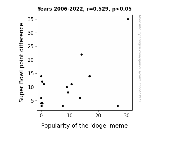 This means 28% of the change in the one variable (i.e., Popularity of the 'doge' meme) is predictable based on the change in the other (i.e., Super Bowl point difference) over the 17 years from 2006 through 2022.