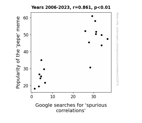 This means 74.1% of the change in the one variable (i.e., Google searches for 'spurious correlations') is predictable based on the change in the other (i.e., Popularity of the 'pepe' meme) over the 18 years from 2006 through 2023.
