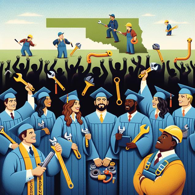 ChatGPT: Picture a university with a graduation ceremony for business students. As they receive their Bachelor's degrees, they are also holding wrenches and wearing plumbers' utility belts. In the background, South Dakota's map shows an increasing number of plunger-wielding professionals setting out to address the growing demand for plumbing services.