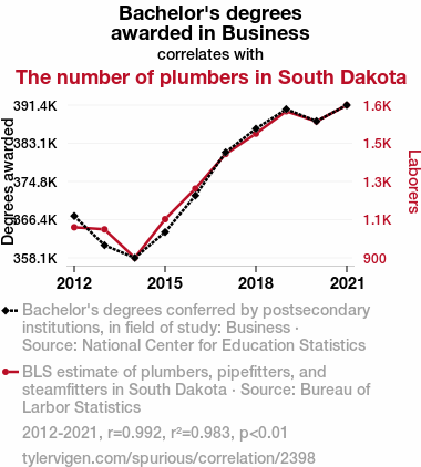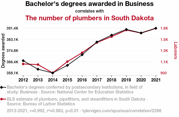 This means 98.3% of the change in the one variable (i.e., The number of plumbers in South Dakota) is predictable based on the change in the other (i.e., Bachelor's degrees awarded in Business) over the 10 years from 2012 through 2021.