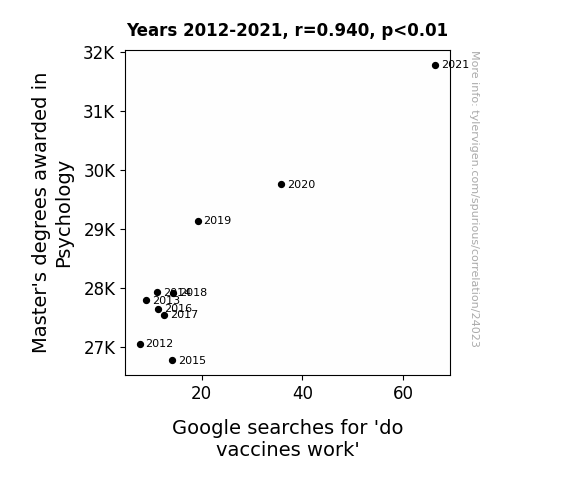 This means 88.4% of the change in the one variable (i.e., Google searches for 'do vaccines work') is predictable based on the change in the other (i.e., Master's degrees awarded in Psychology) over the 10 years from 2012 through 2021.